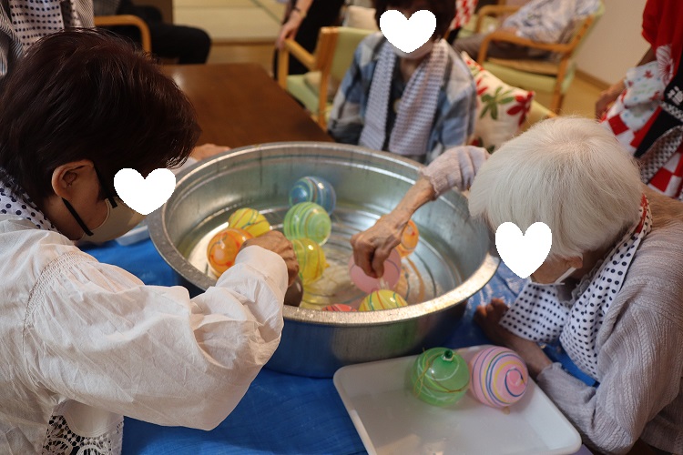 ヨーヨー釣り いくつ取れるか真剣な表情です。